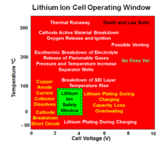 Diagram 1 below shows that, at all times, the cell operating voltage and temperature must be kept within the limits indicated by the green box. Once outside the box permanent damage to the cell will be initiated.